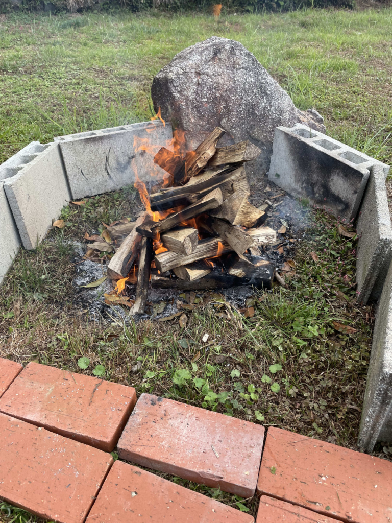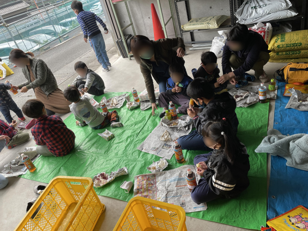 まずは焚き火を用意。それから子どもたちにサツマイモを焼き芋用にする作業をしてもらいました。濡らしたキッチンペーパーで隙間なく包んで、アルミホイルでまた隙間なく包む作業です。みんな楽しそうにしてくれました。