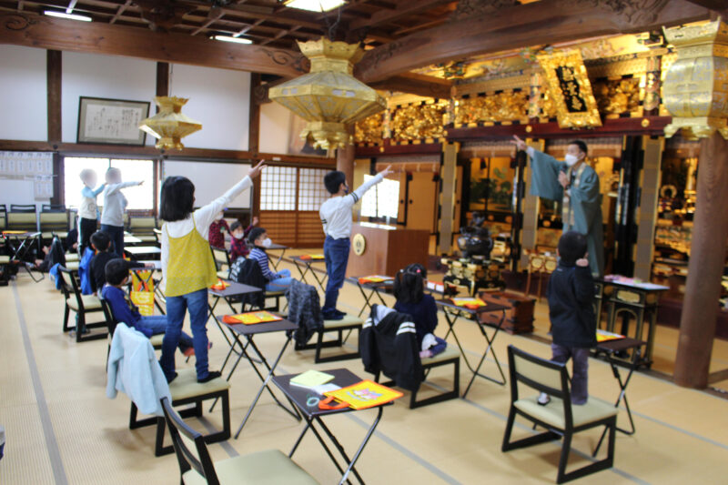 焼き芋が出来上がるまで待っている間、本堂でお経のお勤めとゲームをしました。