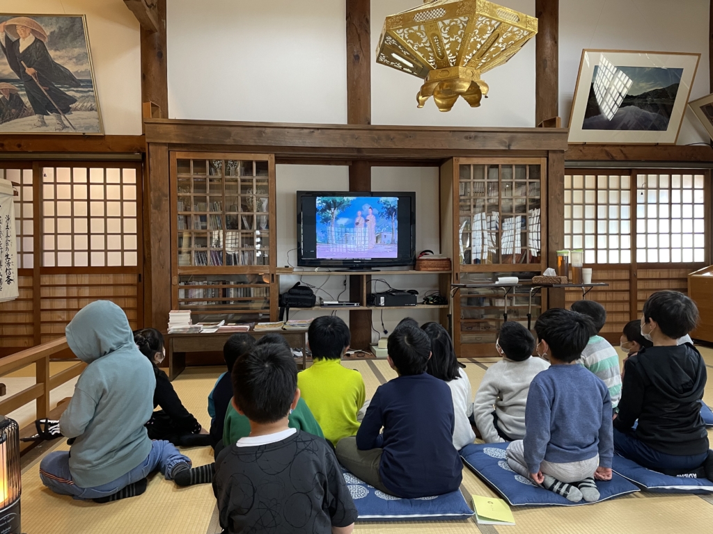 ご法話のかわりに、仏典ビデオ「子どもたちよ」を一緒に鑑賞。お釈迦さまと子どもたちの物語です。
