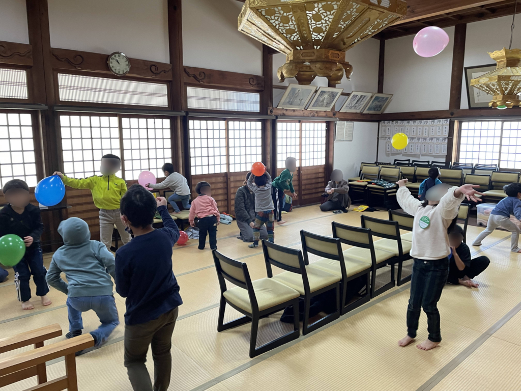 ビデオを見た後には、本堂で遊びます。畳の広いスペースを使って、座布団や椅子、風船で遊びました。みんなとても楽しそうでした!