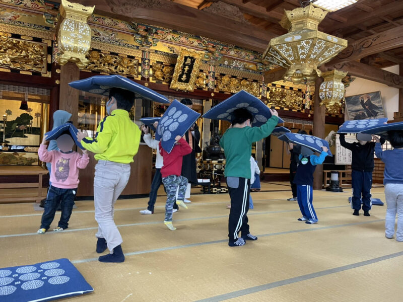 ビデオを見た後には、本堂で遊びます。畳の広いスペースを使って、座布団や椅子、風船で遊びました。みんなとても楽しそうでした!