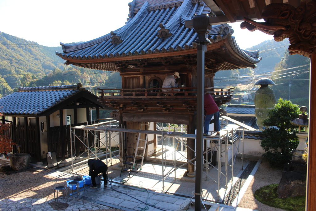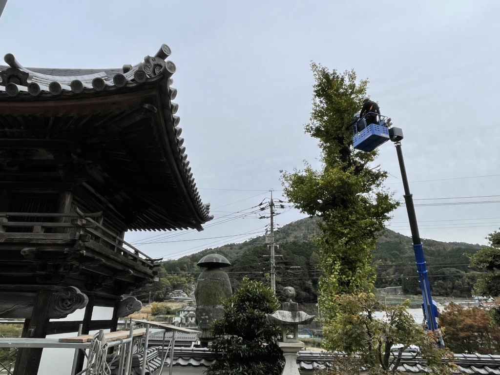 「お寺の大清掃」という言葉にピッタリで、本格的に足場を組んで天井を拭き掃除したり、高所作業車をレンタルして銀杏の剪定をしたりと、大掛かりな行事です。どれもこれも仏教壮年会のメンバーの方々の技術や経験、知識や繋がりのおかげさまです。