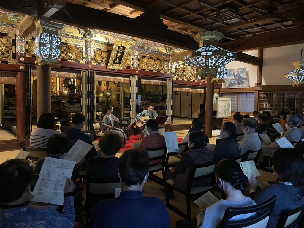 教雲寺の住職も伴奏として参加。秋の夜に懐かしい音色が響きました。