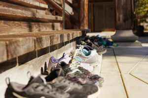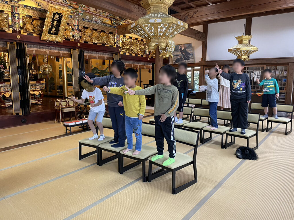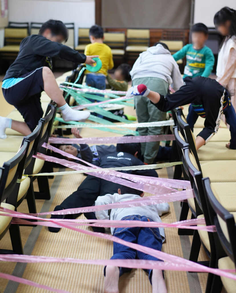 続いては、本堂の椅子とビニールの薄い紐を使って、「蜘蛛の巣トンネル」をつくります。