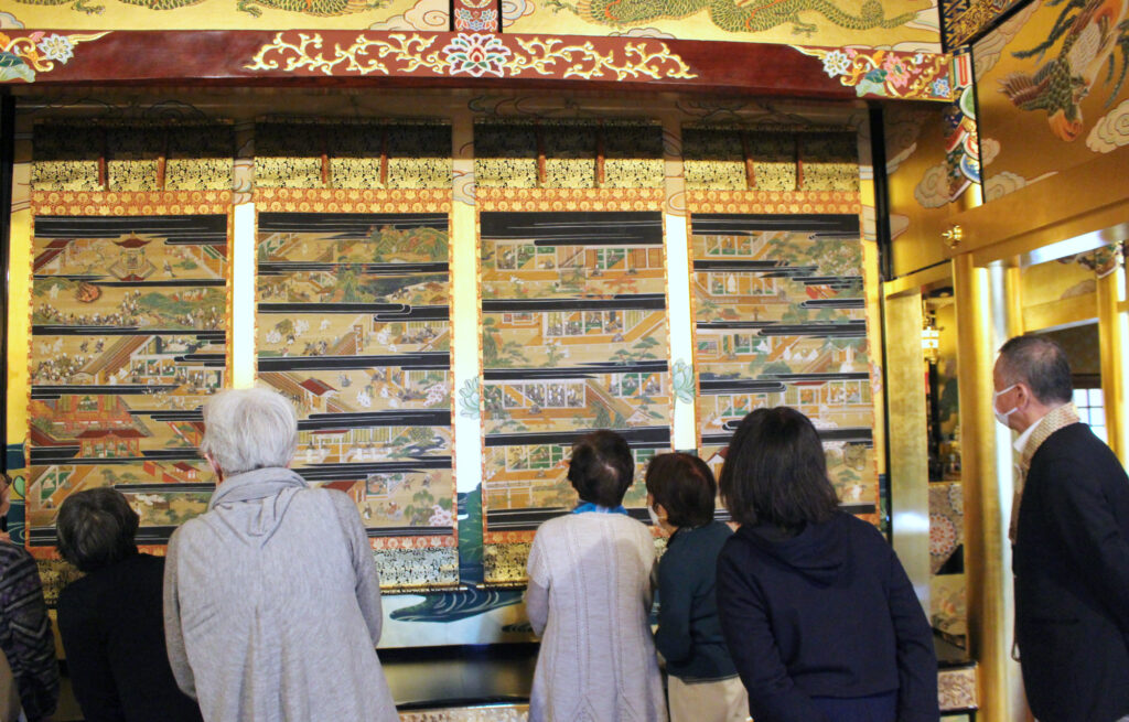 法要の空き時間には、余間にかけてある親鸞聖人のご生涯を描いた御絵伝をご覧の方も。