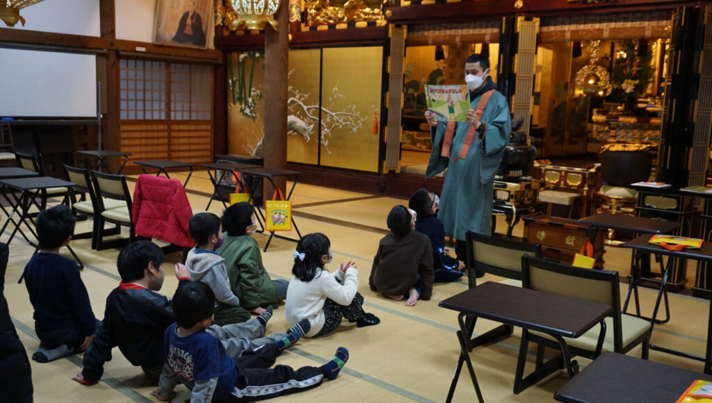 お経の勤行の後には、紙芝居をみんなで楽しみました。読んだのは2つ。