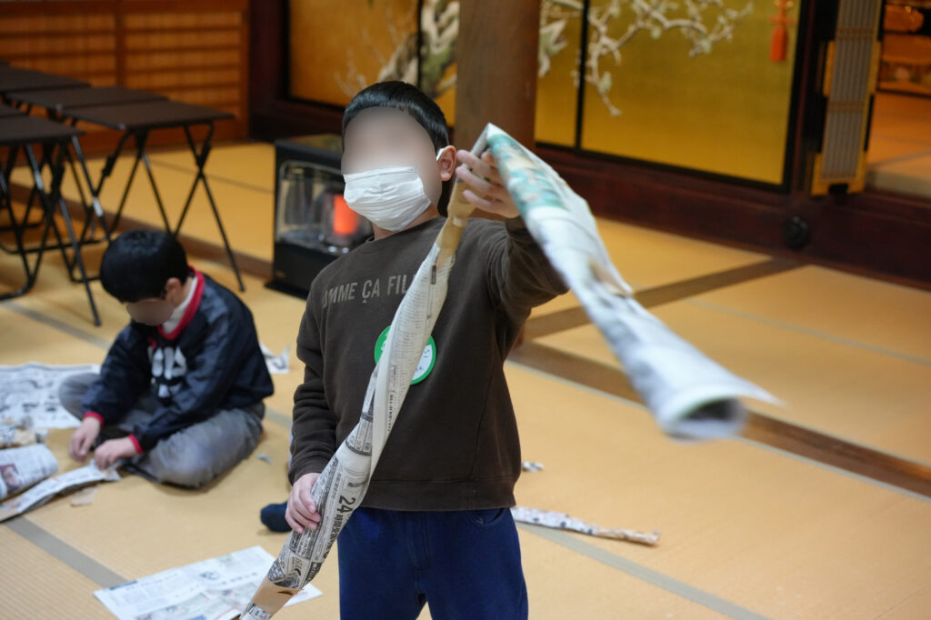 後半のゲームでは、新聞紙で「へび」を作ることに。