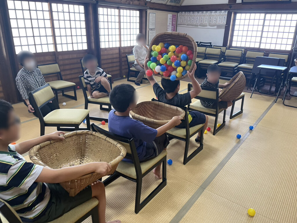 まずは大きなザルを使って、ボールを後ろへ後ろへ渡していくリレーのゲーム。
