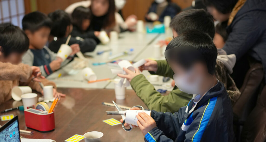 道具を共有したり、助け合ったりしながら自分の紙コップUFOを作っていきます。