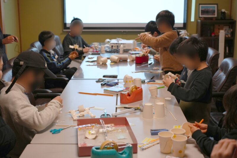 道具を共有したり、助け合ったりしながら自分の紙コップUFOを作っていきます。