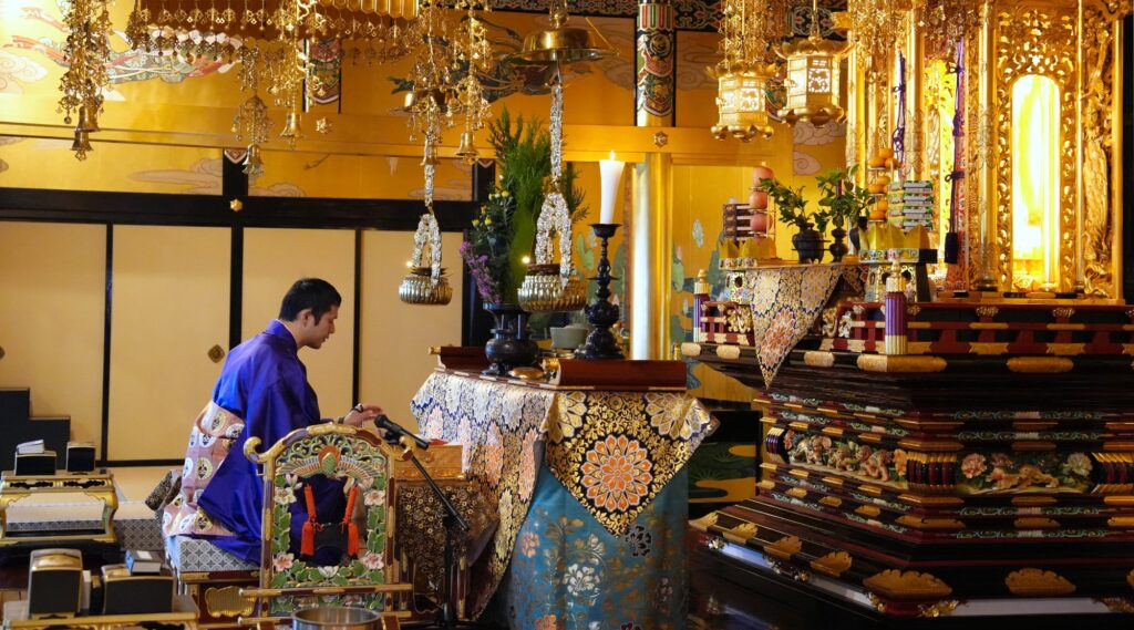 ピカピカにお荘厳(お飾り)された仏さまの前で、お経をお勤めします。