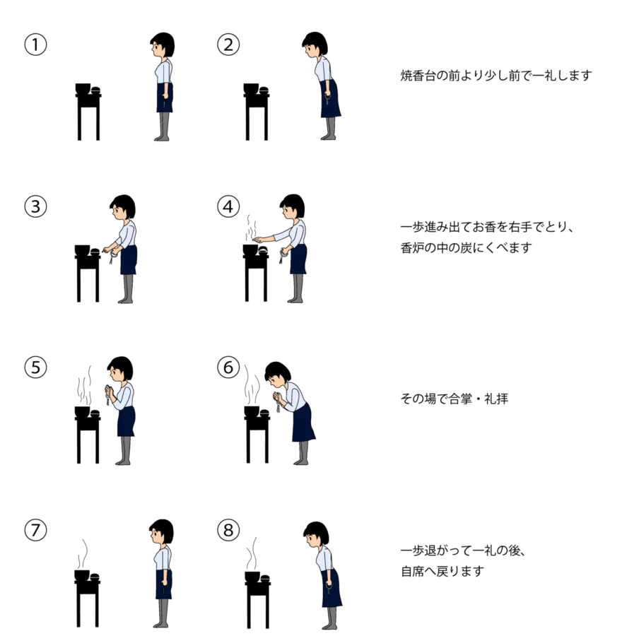 それから、礼拝に移ります。上体を合掌したままの姿勢で約45度前方に傾けます。それからゆっくりと上体を起こして合掌をときます。